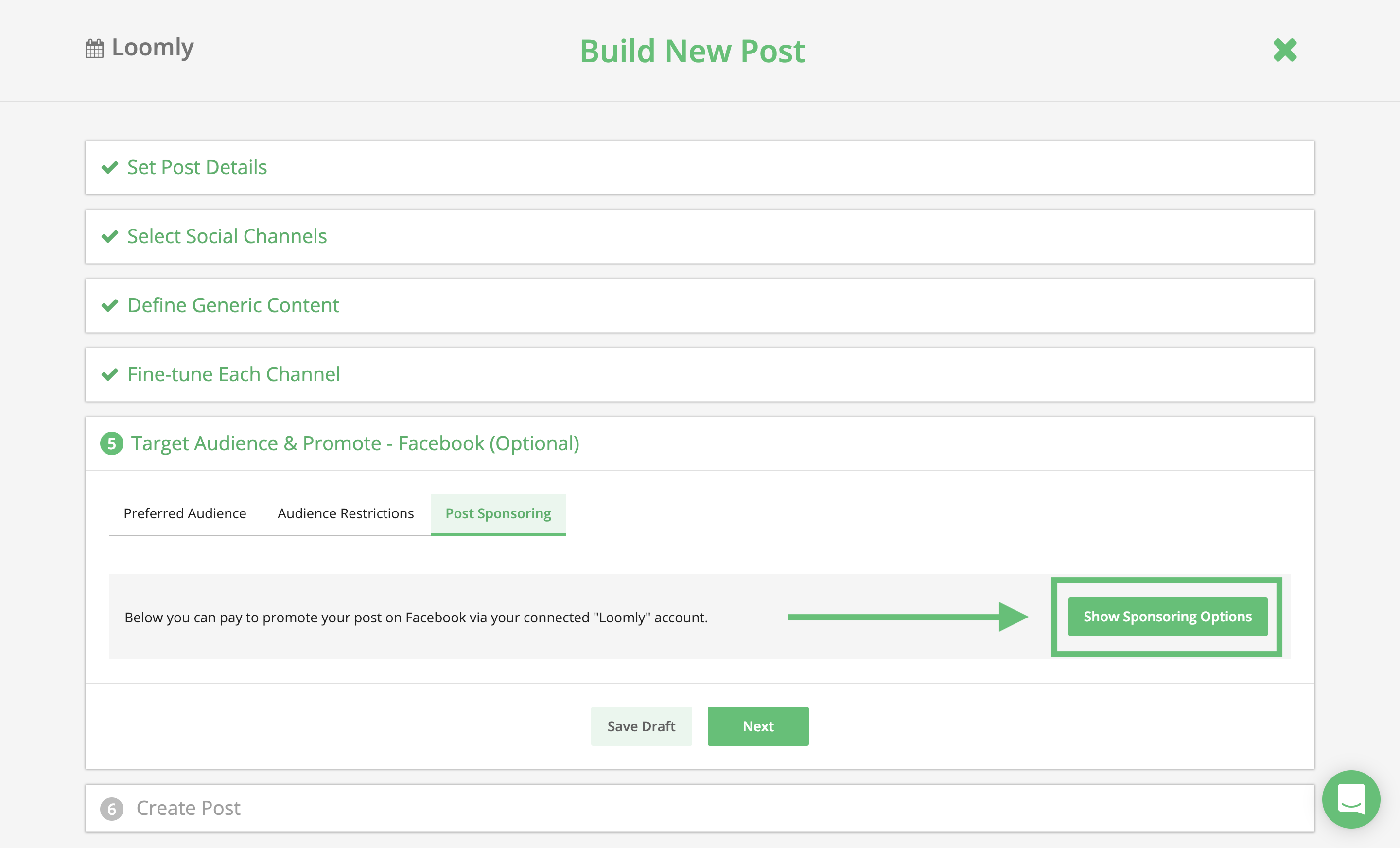 - Jump to Post Builder to create a new post, as usual — making sure to select Facebook as a channel — and go all the way to the fifth panel, titled Target Audience & Promote (Facebook) to visit the Post Sponsoring tab: