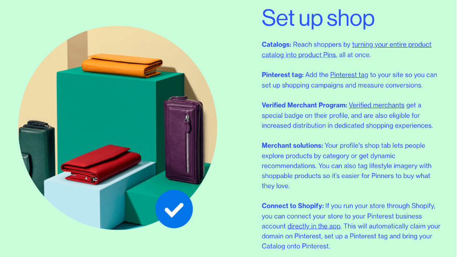 “Share a gorgeous catalog. Set up your storefront. And then get to the good stuff, like tracking conversions and measuring results.”