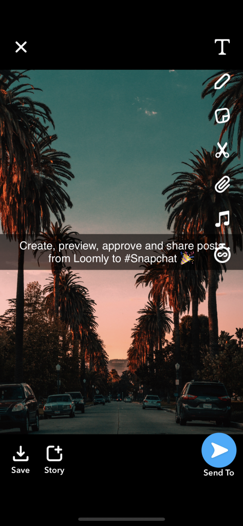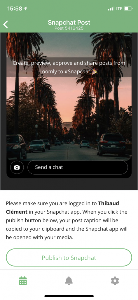 - Clicking on Publish To Snapchat within the Loomly mobile app opens your post into the Snapchat mobile app for publishing, loading your video or photos automatically: