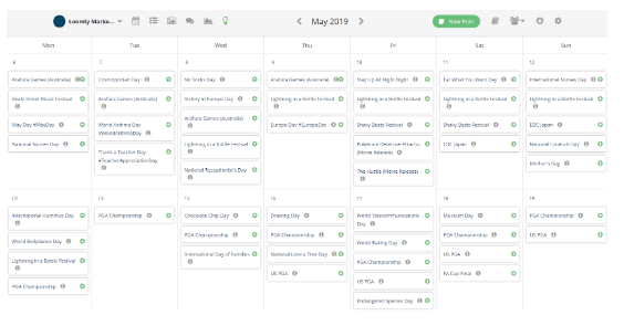 Simply select the “Post ideas” icon – displayed as a lightbulb – from the menu above your calendar. This will show you a complete list of ideas for the coming months: