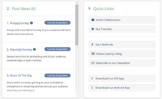 The first is on the bottom row of your Loomly dashboard, where you can see suggestions for the coming week: