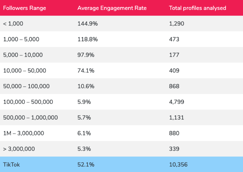After analyzing more than 10,000 profiles, Cloutmeter found that engagement rates vary according to the number of followers. For instance, profiles with less than 1,000 followers had an engagement rate of 144.9%, whereas profiles with 100,000 – 500,000 followers had an engagement rate of 5.9%. Overall, they calculated the average engagement rate on TikTok was 52.1%.