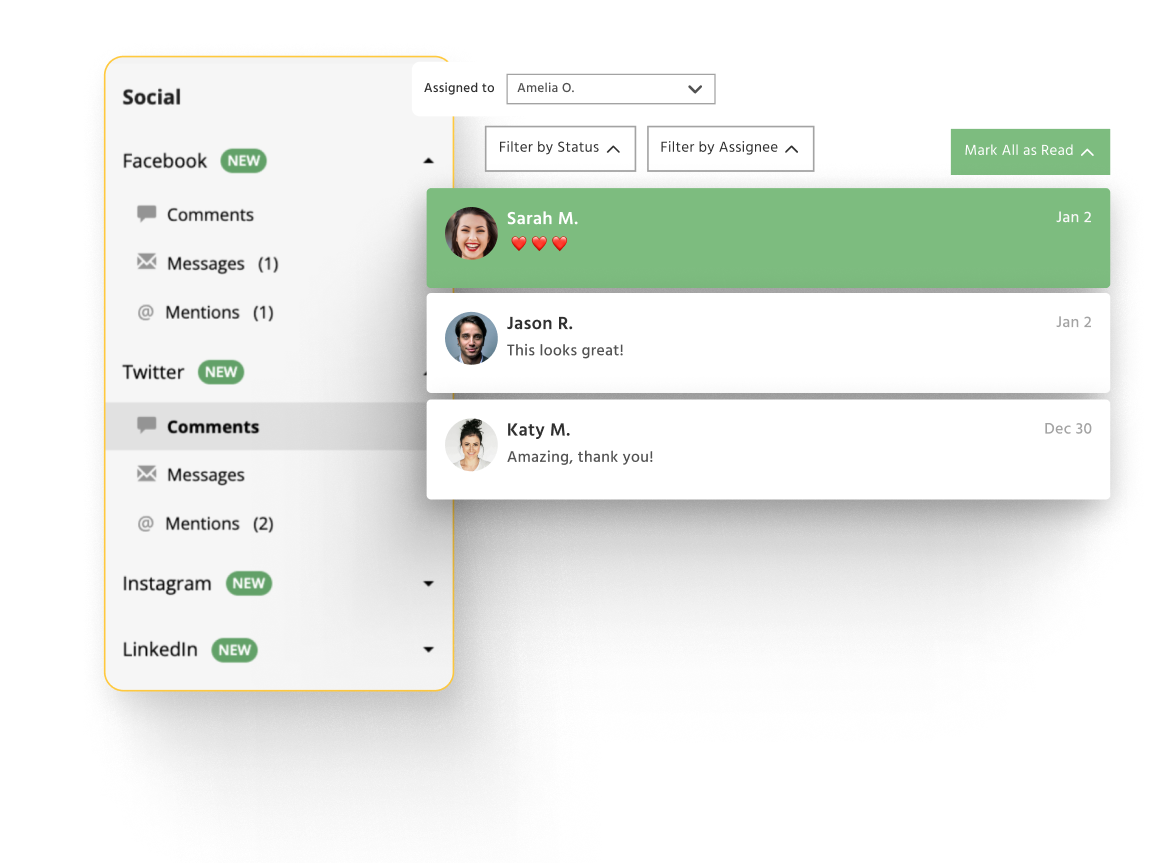 It only takes one negative unanswered review to tank your reputation, so never miss a beat with a unified inbox that brings in conversations. Assign conversations to the most suitable teammate and use Saved Replies to maintain brand message consistency for commonly asked questions.